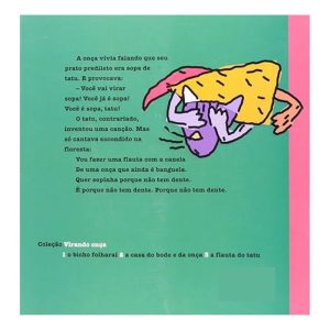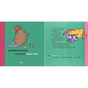 Em A flauta do tatu tudo gira em torno do prato predileto da onça. Advinhem qual era? Sopa de tatu, claro. Pelo menos era isso que ela alardeava aos quatro ventos e, inclusive, na cara do pobre coitado. O tatu ficou tão contrariado que inventou uma canção ridicularizando a onça. Quando ela soube, não vacilou e partiu para tomar satisfação. Nos contos populares brasileiros, a onça sempre representou o poder despótico. Contra ela, surge, em cada história, um animal que, por meio da inteligência, consegue driblar a adversária e, na maioria das vezes, levar a melhor na disputa. Os três títulos da coleção Virando onça – A casa da onça e do bode, O bicho folharal e A flauta do tatu – trazem textos tradicionais protagonizados por este personagem tão familiar à imaginação do povo, e recontados com novos sons e novas cores criados por Angela Lago, grande artista da palavra e da imagem. De estilo literário sucinto e divertido, com ilustrações vibrantes e muito bem-humoradas, os livros garantem a atenção tanto de leitores iniciantes quanto daqueles já com bastante experiência.