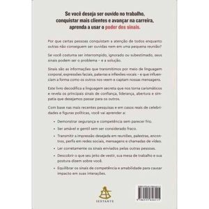 “Este livro reúne anos de pesquisa para ajudar você a se tornar mais confiante, influente e respeitado, sem deixar de ser fiel a si mesmo.” — Mel Robbins, autora de Um único hábito pode mudar sua vida Se você deseja ser ouvido no trabalho, conquistar mais clientes e avançar na carreira, aprenda a usar o poder dos sinais. Por que certas pessoas conquistam a atenção de todos enquanto outras não conseguem ser ouvidas nem em uma pequena reunião? Se você costuma ser interrompido, ignorado ou subestimado, seus sinais podem ser o problema – e a solução. Sinais são as informações que enviamos por meio de linguagem corporal, expressões faciais, palavras e inflexões vocais, que influenciam como os outros nos veem e captam nossas mensagens. Este livro decodifica a linguagem secreta que nos torna carismáticos e revela os principais sinais de confiança, liderança, abertura e simpatia que desejamos passar para os outros. Com base nas mais recentes pesquisas e em casos reais de celebridades e governantes, você vai aprender a: • Demonstrar segurança e competência sem parecer frio. • Ser amável e gentil sem ser considerado fraco. • Transmitir a impressão desejada em reuniões, palestras, encontros, perfis em redes sociais, mensagens e chamadas de vídeo. • Ler corretamente os sinais enviados pelas outras pessoas. • Descobrir o que seu jeito de vestir, sua mesa de trabalho e sua postura dizem sobre você. • Equilibrar os sinais de competência e amabilidade para causar impacto em suas interações.
