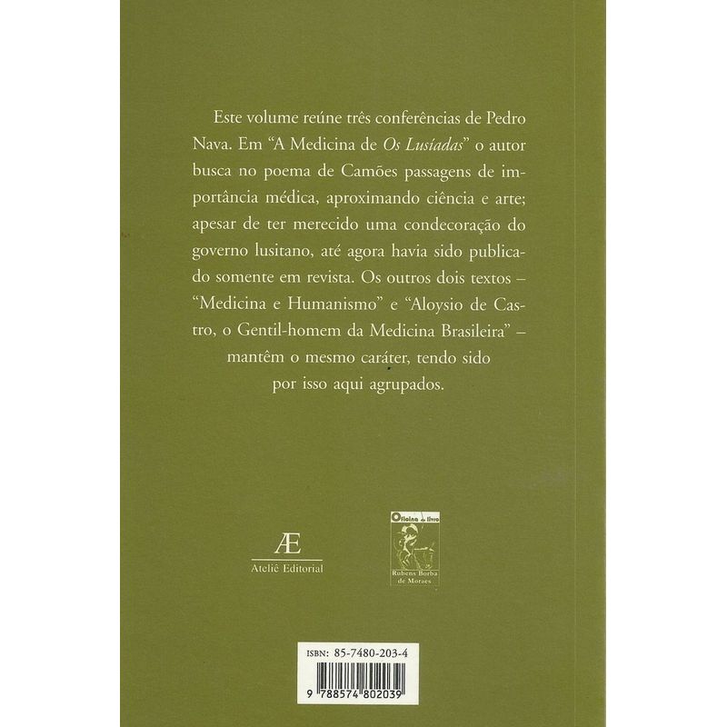 Pedro Nava aproxima ciência e arte ao buscar, na obra-prima de Camões, passagens de relevância médica. Esta conferência foi proferida no Real Gabinete Português de Leitura, em 1961. Nava foi muito aplaudido, e a repercussão do texto rendeu ao autor uma condecoração do governo lusitano. Este livro conta ainda com dois outros artigos de sua autoria: “Medicina e Humanismo” e “Aloysio de Castro, o Gentil-homem da Medicina Brasileira”, que apesar do tema possuem um caráter literário. Coedição Oficina do Livro
