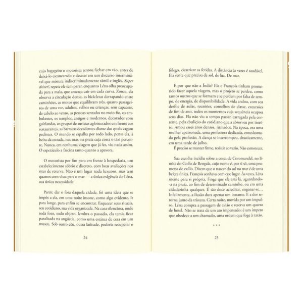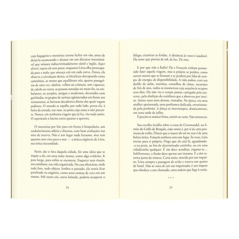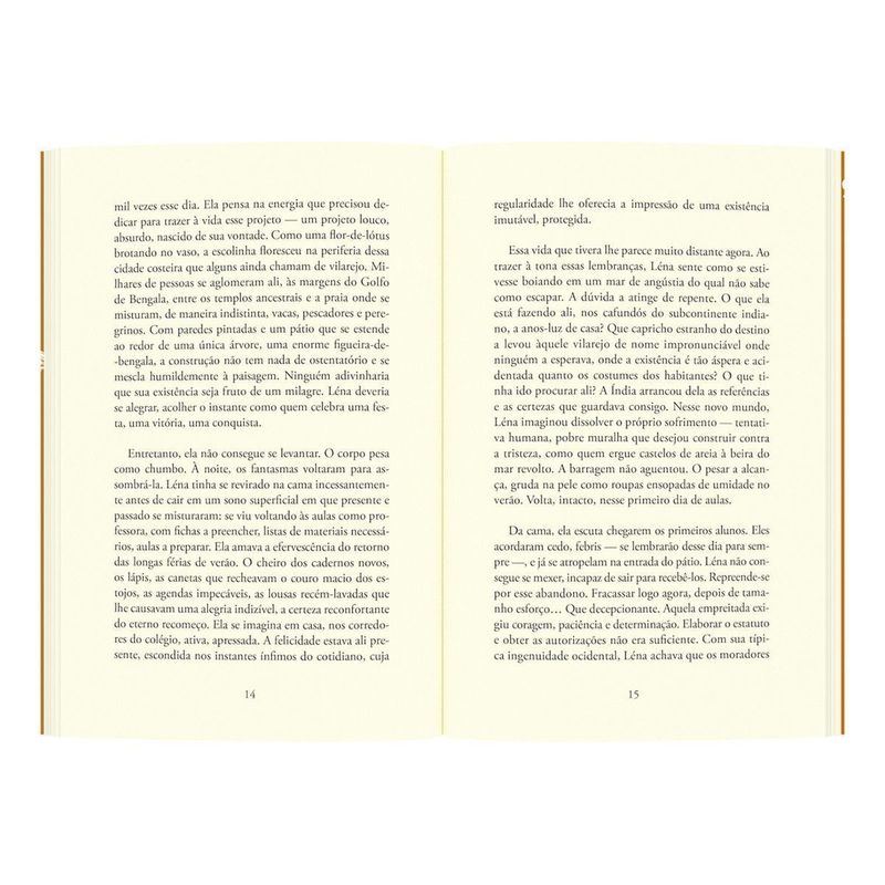 Novo romance da autora do best-seller A trança aborda a força da sororidade e da educação em meio à pobreza e às injustiças na sociedade indiana Abalada por uma tragédia, Léna se autoexila no limite do Golfo de Bengala, no oceano Índico, movida pela esperança de se recuperar naquele lugar cujo caos das ruas e a calmaria do mar abafariam o eco de suas dores. Assombrada pelos fantasmas do passado, que a visitam toda noite, Léna encontra alento no ritual de tomar banho de mar pelas manhãs, quando só os pescadores estão de pé. De vez em quando, vê uma pipa no céu, tão pequena quanto a criança que a solta ao longe. Certo dia, por um descuido proposital ou mero infortúnio, a correnteza a puxa para o fundo e ela acaba se afogando. Mas, como numa cena orquestrada pelo destino, quem salva sua vida é a criança que costuma ver na praia. A menina pede ajuda à jovem chefe da Brigada Vermelha — um grupo de mulheres que praticam autodefesa e treinavam ali perto no momento —, que, junto da tropa, consegue socorrer Léna milagrosamente a tempo. A princípio, Léna não sabe como agradecer, mas, ao conhecê-las, tem uma ideia: usar a experiência de seus vinte anos como professora para ensinar a mulher e a criança — que, curiosamente, vive em um silêncio absoluto — a ler e escrever. O que não planejou nem pôde prever é que, com o tempo, vai criar raízes cada vez mais fortes no lugar. Contra todas as probabilidades, em um vilarejo marcado pela miséria e pelas injustiças de anos de tradições profundamente arraigadas, Léna se vê ancorada pelo segredo por trás do silêncio daquela menina, pela determinação explosiva da chefe do grupo de autodefesa feminino e pela própria convicção de que a educação é a única ferramenta capaz de libertar mulheres e crianças do destino atrelado a elas desde o nascimento.