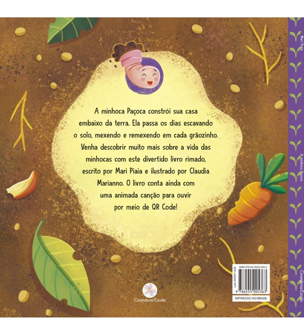 A minhoca Paçoca constrói sua casa embaixo da terra. Ela passa os dias escavando a terra, mexendo e remexendo em cada grãozinho. Venha descobrir muito mais sobre a vida das minhocas com esse divertido livro rimado, escrito por Mari Piaia e ilustrado por Claudia Marianno. O livro conta ainda com uma animada canção!