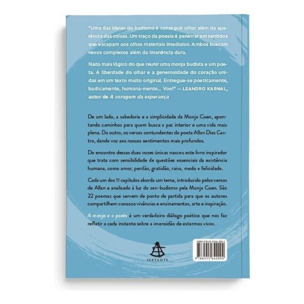 A monja e o poeta é um verdadeiro diálogo poético que nos faz refletir a cada instante sobre a imensidão de estarmos vivos. “Uma das ideias do budismo é conseguir olhar além da aparência das coisas. Um traço da poesia é penetrar em sentidos que escapam aos olhos materiais imediatos. Ambos buscam nexos complexos além da imanência dura. Nada mais lógico do que reunir uma monja budista e um poeta. A liberdade do olhar e a generosidade do coração unidas em um texto muito original. Entregue-se poeticamente, budicamente, humana-mente… Voe!” — LEANDRO KARNAL, autor de A coragem da esperança De um lado, a sabedoria e a simplicidade da Monja Coen, apontando caminhos para quem busca a paz interior e uma vida mais plena. Do outro, os versos contundentes do poeta Allan Dias Castro, dando voz aos nossos sentimentos mais profundos. Do encontro dessas duas vozes únicas nasceu este livro inspirador que trata com sensibilidade de questões essenciais da existência humana, como amor, perdão, gratidão, raiva, medo e felicidade. Cada um dos 11 capítulos aborda um tema, introduzido pelos versos de Allan e analisado à luz do zen-budismo pela Monja Coen. São 22 poemas que servem de ponto de partida para que os autores compartilhem conosco vivências e ensinamentos, arte e inspiração.