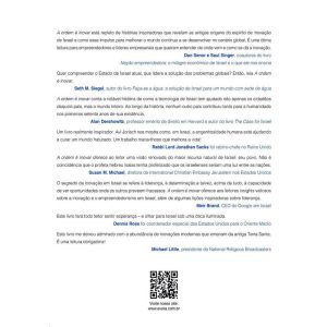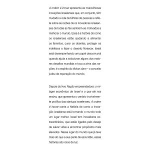 Com tradução em trinta idiomas, “A ordem é inovar”, apresenta as maravilhosas inovações israelenses que, em conjunto, têm mudado a vida de bilhões de pessoas e reflete sobre as razões de os inovadores israelenses de todas as fés sentirem-se motivados a melhorar o mundo. Essa é a história de como os israelenses estão ajudando a alimentar os famintos, curar os doentes, proteger os indefesos e fazer o deserto florescer. Israel está desempenhando um papel descomunal quando ajuda a solucionar alguns dos maiores desafios mundiais e toca a alma das nações: é o espírito do tikku olam – o conceito judeu de reparação do mundo. Depois do livro “Nação empreendedora: o milagre econômico de Israel e o que ele nos ensina”, que apresenta o cenário incrivelmente prolífico das startups israelenses, “A ordem é inovar” conta como a inovação israelense está tornando o mundo um lugar melhor. Israel tem inovadores extraordinários, que estão ligados pelo desejo de salvar vidas e encontrar propósitos mais elevados. Nesse lugar do mundo que já teve mais do que a sua parte de escuridão, essas histórias são raios de luz.