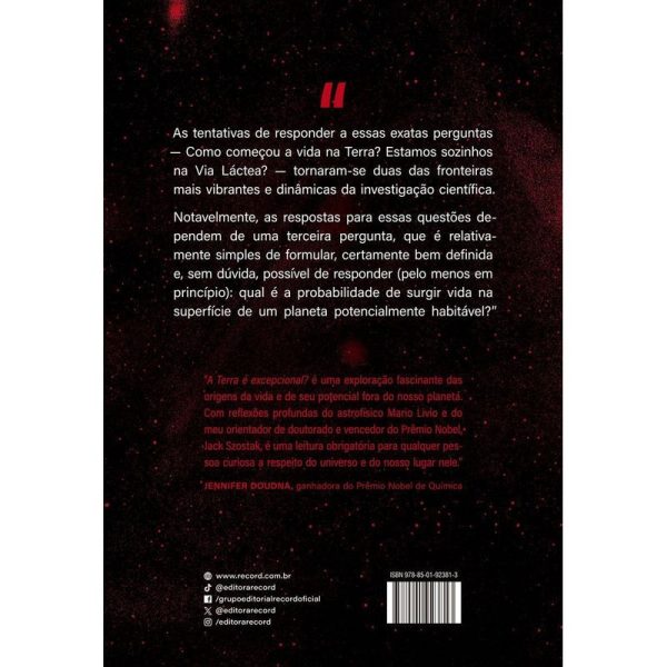 A Terra é excepcional? é uma fascinante jornada científica sobre as origens da vida e a possibilidade dela ser encontrada fora do nosso planeta, escrita por um astrofísico bestseller e um biólogo laureado pelo Nobel. Por muito tempo, cientistas se perguntaram como a vida pode ter emergido da química inanimada, ou se ela existe apenas na Terra. Charles Darwin especulou no século XIX sobre a vida como conhecemos ter começado em um lago morno. Alguns de seus contemporâneos acreditavam que havia vida em Marte. À época, parecia inevitável que, a essa altura, já teríamos essas respostas, o que ainda não aconteceu. No entanto, como o astrofísico Mario Livio e o biólogo molecular e ganhador do Nobel Jack Szostak revelam neste livro, o véu que ainda encobre esta questão está finalmente sendo levantado. Baseando-se em descobertas recentes, os autores explicam como os blocos fundamentais da vida — como o RNA, os aminoácidos e as células — poderiam ter surgido do caos primordial do planeta. Além disso, discutem de forma multidisciplinar a busca por vida além da Terra, considerando tanto formas que conhecemos como possíveis variações. Seria a vida o resultado de um acidente ou um imperativo químico? A Terra é excepcional? é uma reflexão profunda sobre a origem e o destino da vida no universo, escrita por dois dos principais pensadores sobre este tema na atualidade. “A situação mudou drasticamente nas últimas três décadas. As tentativas de responder a essas exatas perguntas — Como começou a vida na Terra? Estamos sozinhos na Via Láctea? — tornaram-se duas das fronteiras mais vibrantes e dinâmicas da investigação científica. Notavelmente, as respostas para essas questões dependem de uma terceira pergunta, que é relativamente simples de formular, certamente bem definida e sem dúvida possível de responder (pelo menos em princípio): qual é a probabilidade de surgir vida na superfície de um planeta potencialmente habitável?”