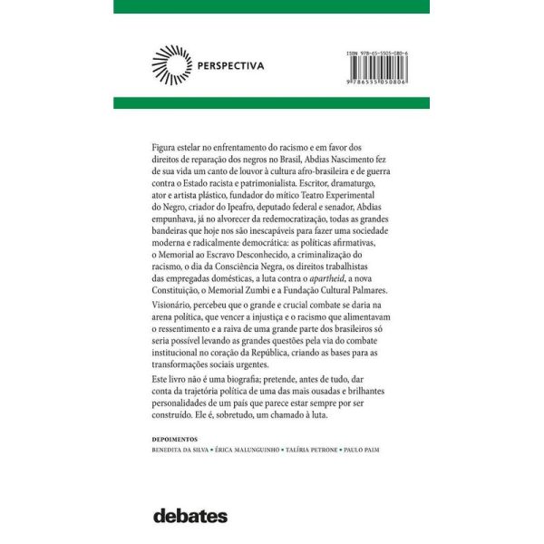 SINOPSE Abdias Nascimento foi uma das mais importantes e brilhantes lideranças do Brasil, dedicando-se intensamente ao enfrentamento do racismo e à promoção do legado cultural afro-brasileiro. Escritor, artista plástico, dramaturgo, deixou um legado cultural incontornável através do TEN, Teatro Experimental do Negro, das pinturas que realçam sua ligação com a cultura africana e dos livros que denunciam o racismo e a violência das relações étnico raciais no Brasil. Na década de 1980, volta-se à política institucional do Congresso Nacional, onde acreditava ser necessário pôr em pauta as questões raciais e implementar políticas públicas de reparação. Muito do debate e das políticas públicas que assistimos hoje e que foram implementadas no país devemos à sua atuação parlamentar. Essa atuação é o objeto deste livro. QUARTA-CAPA Figura estelar no enfrentamento do racismo e em favor dos direitos de reparação dos negros no Brasil, Abdias Nascimento fez de sua vida um canto de louvor à cultura afro-brasileira e de guerra contra o Estado racista e patrimonialista. Escritor, dramaturgo, ator e artista plástico, fundador do mítico Teatro Experimental do Negro, criador do Ipeafro, deputado federal e senador, Abdias empunhava, já no alvorecer da mocratização, todas as grandes bandeiras que hoje nos são inescapáveis para fazer uma sociedade moderna e radicalmente democrática: as políticas afirmativas, o Memorial ao Escravo Desconhecido, a criminalização do racismo, o dia da Consciência Negra, os direitos trabalhistas das empregadas domésticas, a luta contra o apartheid, a nova Constituição, o Memorial Zumbi e a Fundação Cultural Palmares. Visionário, percebeu que o grande e crucial combate se daria na arena política, que vencer a injustiça e o racismo que alimentavam o ressentimento e a raiva de uma grande parte dos brasileiros só seria possível levando as grandes questões pela via do combate institucional no coração da República, criando as bases para as transformações sociais urgentes. Este livro não é uma biografia; pretende, antes de tudo, dar conta da trajetória política de uma das mais ousadas e brilhantes personalidades de um país que parece estar sempre por ser construído. Ele é, sobretudo, um chamado à luta. NOME DA COLEÇÃO A coleção Debates dedica-se aos temas contemporâneos e aos debates e polêmicas da atualidade. A mais antiga, junto com a Estudos, e a mais conhecida das coleções da editora, conta com quase 350 títulos, alguns já célebres na literatura de não ficção.