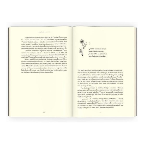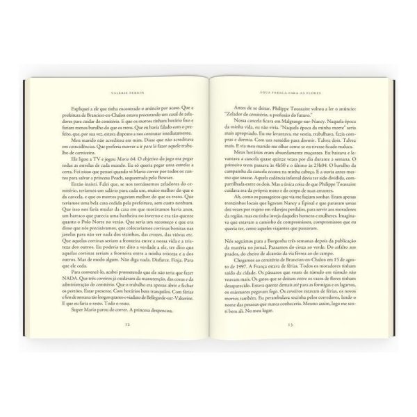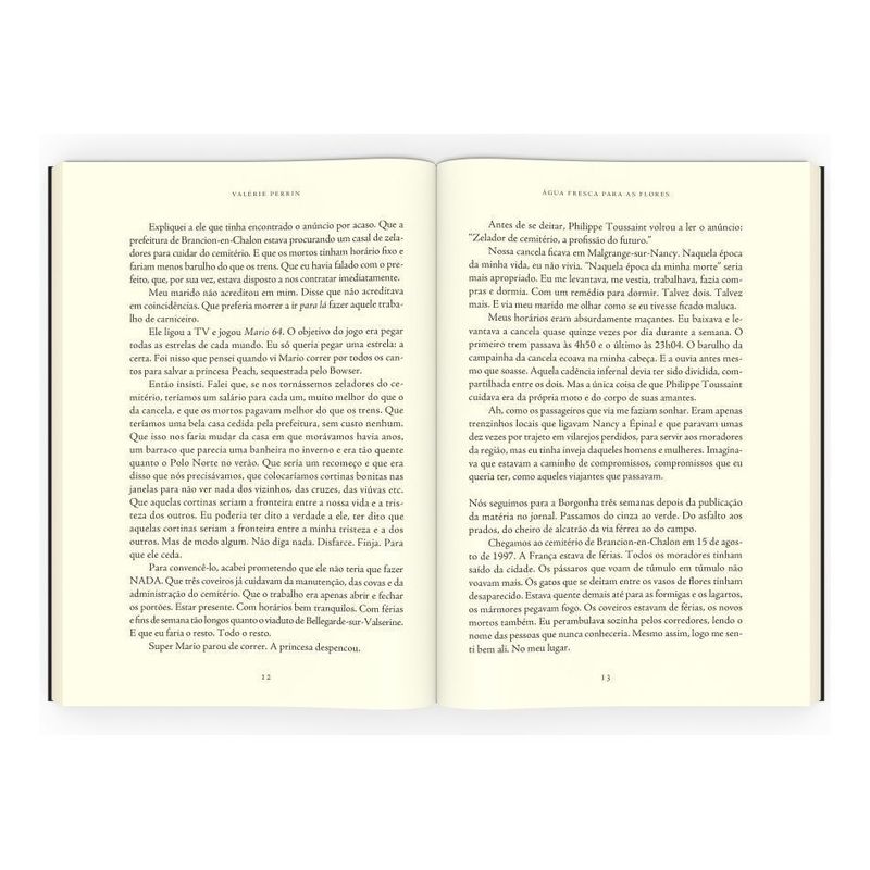 Um dos maiores fenômenos editoriais da Europa dos últimos anos, Água fresca para as flores traz uma sensível história de amor no peculiar cenário de um cemitério. Os dias de Violette Toussaint são marcados por confidências. Para aqueles que vão prestar homenagens aos entes queridos, a casa da zeladora do cemitério funciona também como um abrigo diante da perda, um lugar em que memórias, risadas e lágrimas se misturam a xícaras de café ou taças de vinho. Com a pequena equipe de coveiros e o padre da região, Violette forma uma família peculiar. Mas como ela chegou a esse mundo onde o trágico e o excêntrico se combinam? Com quase cinquenta anos, a zeladora coleciona fantasmas — uma infância conturbada, um marido desaparecido e feridas ainda mais profundas —, mas encontra conforto entre os rituais e as flores de seu cemitério. Sua rotina é interrompida, no entanto, pela chegada de Julien Seul, um homem que insiste em deixar as cinzas da mãe no túmulo de um completo desconhecido. Logo fica claro que essa atitude estranha está ligada ao passado difícil de Violette, e esse encontro promete desenterrar sentimentos há muito esquecidos. À medida que os laços entre os vivos e os mortos são expostos, acompanhamos a história dessa mulher que acredita de forma obstinada na felicidade, mesmo após tantas provações. Com sua comovente e poética ode ao cotidiano, Água fresca para as flores é um relato íntimo e atemporal sobre a capacidade de nção do amor.