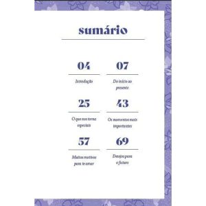 Nesse diário guiado, você poderá registrar os momentos especiais que viveu com o seu amor e tudo o que ele representa na sua vida. Você preenche e depois o dá de presente à pessoa amada como um inesquecível livro de memórias do afeto compartilhado. A única coisa melhor do que amar é poder compartilhar todo o amor que se sente. É para isso que serve este livro, que traz várias perguntas e sugestões de tópicos pensadas para reavivar aquela alegria nervosa do início da paixão, registrar o que há de mais especial na relação, eternizar os momentos mais importantes vividos pelo casal e fazer refletir sobre o que se espera do futuro, não importa o tempo de relacionamento ou o estado civil. Mas é claro: abrir o coração por escrito só tem graça se, no fim, todas as respostas forem compartilhadas com a pessoa amada.