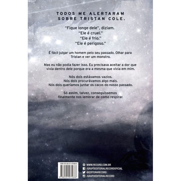 O novo romance da autora de Sr. Daniels Como superar a dor de uma perda irreparável? Elizabeth está tentando seguir em frente. Depois da morte do marido e de ter passado um ano na casa da mãe, ela decide voltar a seu antigo lar e enfrentar as lembranças de seu casamento feliz com Steven. Porém, ao retornar à pequena Meadows Creek, ela se depara com um novo vizinho, Tristan Cole. Grosseiro, solitário, o olhar sempre agressivo e triste, ele parece fugir do passado. Mas Elizabeth logo descobre que, por trás do ser intratável, há um homem devastado pela morte das pessoas que mais amava. Elizabeth tenta se aproximar dele, mas Tristan tenta de todas as formas impedir que ela entre em sua vida. Em seu coração despedaçado parece não haver espaço para um novo começo. Ou talvez sim.
