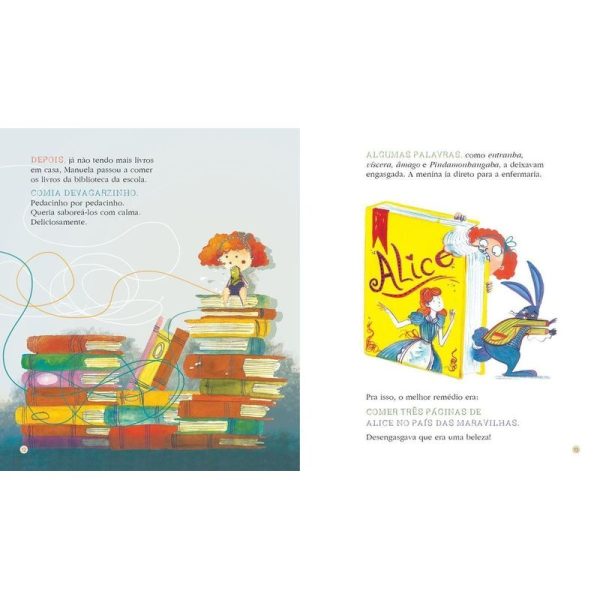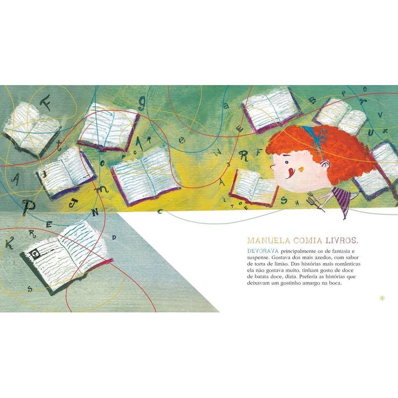 Manuela comia livros. Devorava principalmente os de fantasia e suspense. Gostava dos mais azedos, com sabor de torta de limão. Das histórias mais românticas ela não gostava muito, tinham gosto de doce de batata doce, dizia.” E foi por causa dessa mania de comer livros que Manuela viveu uma aventura incrível e muito, muito diferente… Cheia de susto e suspense, mas também com muita alegria.
