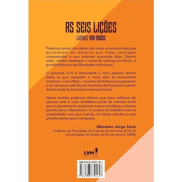 As Seis Lições reúne as palestras ministradas, em 1959, por Ludwig von Mises na Universidade de Buenos Aires (UBA). O autor discute com clareza o capitalismo, o socialismo, o intervencionismo, a inflação, o investimento estrangeiro e as relações entre política e ideias. Em linguagem agradável, a obra apresenta as linhas gerais do pensamento misesiano sendo, ao mesmo tempo, uma das melhores introduções à Política e à Economia. Além do prefácio original de Margit von Mises, viúva do autor, a presente edição conta com uma apresentação bibliográfica do economista austríaco escrita por Helio Beltão e Alex Catharino.
