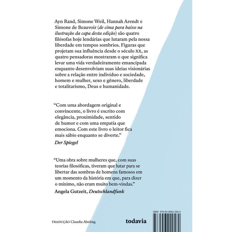 A década de 1933 a 1943 marcou um dos capítulos mais tenebrosos da humanidade. Em meio ao horror da ascensão do nazismo e da carnificina da Segunda Guerra, quatro mulheres — Simone de Beauvoir, Simone Weil, Ayn Rand e Hannah Arendt — libertaram-se dos grilhões do gênero e provaram que a emancipação do pensamento podia ocorrer mesmo em meio a situações extremas. Com grande habilidade narrativa e um equilíbrio magistral entre a apresentação biográfica e a análise acurada de ideias, Wolfram Eilenberger nos oferece a história de quatro vidas hoje legendárias que, em meio à convulsão, mudaram nossa forma de entender o mundo e lançaram as bases para uma sociedade muito mais livre. Seus reflexos chegam até os nossos dias em temas como gênero, identidade, religião, liberdade, sexo e autonomia. As pensadoras estavam na casa dos trinta anos no período coberto pelo livro e ainda não tinham alcançado a fama que teriam nas décadas posteriores. E, na verdade, quase todas tiveram problemas para editar suas obras. Mesmo quando suas experiências de vida diferem marcadamente, elas têm ainda um denominador comum: eram mulheres cuja inteligência lhes permitiu romper os moldes da época. As aventuras dessas quatro visionárias as levaram da Leningrado de Stálin à Hollywood da era dos grandes estúdios; da Berlim das batalhas campais entre nazistas e comunistas à Paris ocupada por Hitler; das brutalizantes fábricas europeias a Nova York, que recebia, generosa, os refugiados do Velho Mundo. Mas, sobretudo, é a jornada do pensamento delas que daria origem às ideias revolucionárias sem as quais o nosso presente e o nosso futuro não seriam os mesmos.