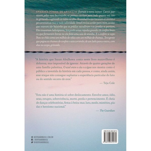 Palestina, 1947. Beit Daras é uma vila tranquila rodeada por oiras e lar da família Baraka. Quando forças israelenses surgem nos arredores, ninguém suspeita do terror que está prestes a acontecer. Logo a vila está em chamas. Entre fumaça e cinzas, famílias precisam abrir caminho até os campos de refugiados em Gaza, em uma viagem que testará seus limites. Após chegarem, nada mais é o mesmo. Em uma narrativa que vai do mágico ao terrivelmente real, percorrendo pontos no Oriente Médio e na América em diversas gerações de uma mesma família, O azul entre o céu e a água conta a história de mulheres imperfeitas, porém profundamente corajosas, de corações partidos, de resistência, de renovação.