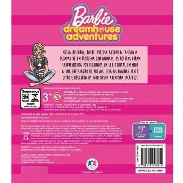 Nesta história, Barbie precisa ajudar a família a escapar de um problema com animais. Os Roberts foram surpreendidos por bichinhos em seu quintal em meio a uma infestação de pulgas. Leia as páginas deste livro e descubra os sons desta aventura incrível!