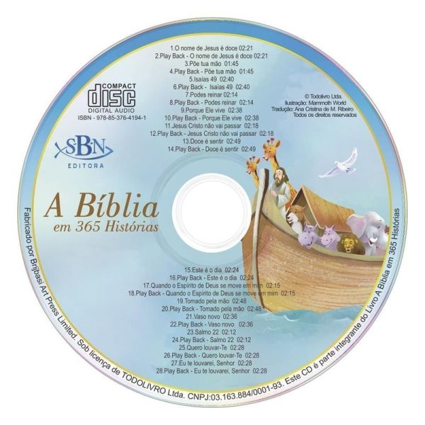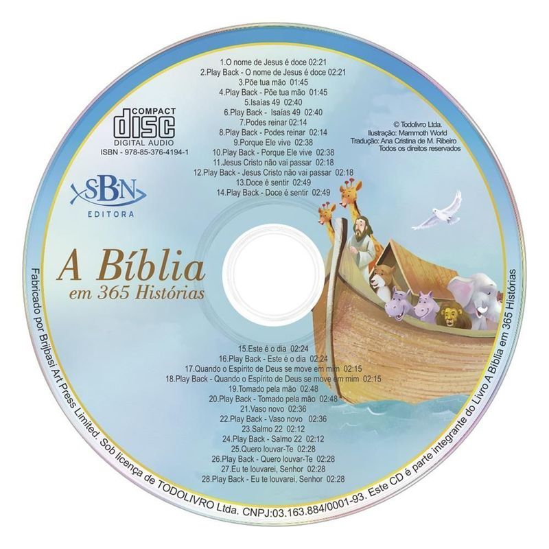 • Acompanha CD com 14 Canções (com faixas playback). • Preciosos ensinamentos que transmitem importantes lições por meio de exemplos.• Textos em linguagem acessível aos pequenos.• Tema de grande relevância entre as famílias, na formação de valores cristãos.• Uma ferramenta importante para ser utilizada por Educadores cristãos.Este obra reúne 365 Histórias Bíblicas para os jovens leitores conhecerem e refletirem sobre a palavra de Deus e a semearem. Com ela, os pequenos aprenderão lições importantes e aperfeiçoarão valores espirituais de amor e de fraternidade.