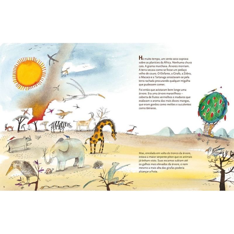 Os animais estão muito, muito famintos. Então eles veem uma árvore maravilhosa, coberta de frutos vermelhos e maduros, que exalam o aroma de doces mangas, são gordos como melões e suculentos como tâmaras… MAS… Enrolado em volta da árvore está o MAIOR PÍTON que eles tinham visto na vida. E o Píton só vai deixar os animais comerem as frutas se eles disserem o nome da árvore. Qual será o nome? O Rei da Floresta é o único que sabe, e ele mora longe, muito longe…