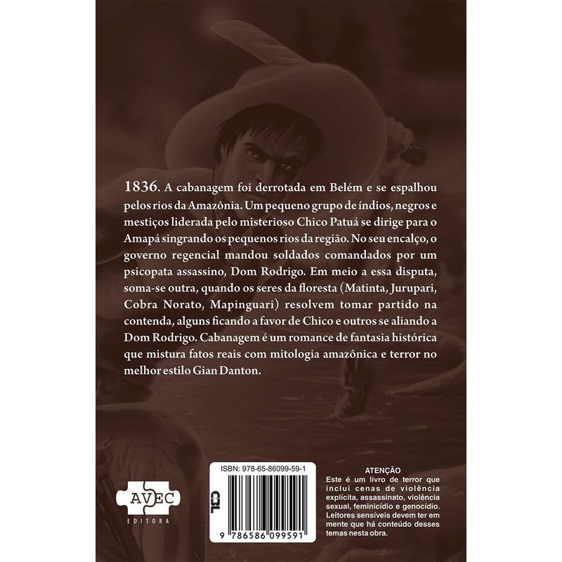 1836. A cabanagem foi derrotada em Belém e se espalhou pelos rios da Amazônia. Um pequeno grupo de índios, negros e mestiços liderada pelo misterioso Chico Patuá se dirige para o Amapá singrando os pequenos rios da região. No seu encalço, o governo regencial mandou soldados comandados por um psicopata assassino, Dom Rodrigo. Em meio a essa disputa, soma-se outra, quando os seres da floresta (Matinta, Jurupari, Cobra Norato, Mapinguari) resolvem tomar partido na contenda, alguns ficando a favor de Chico e outros se aliando a Dom Rodrigo. Cabanagem é um romance de fantasia histórica que mistura fatos reais com mitologia amazônica e terror no melhor estilo Gian Danton.