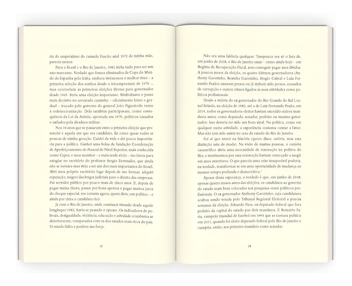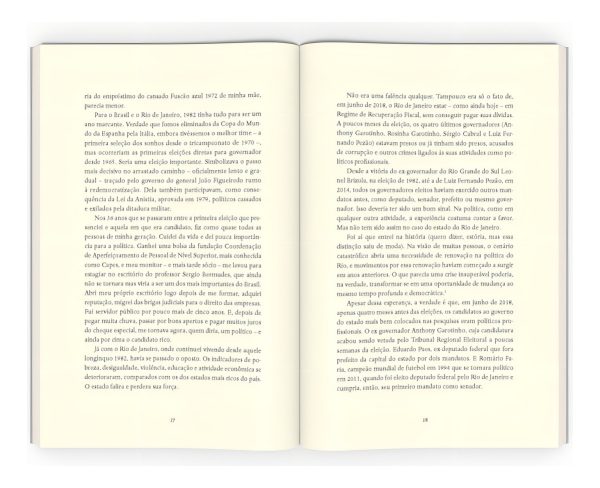 No segundo semestre de 2018, diante do quadro te- nebroso do estado do Rio de Janeiro – minado pela corrupção generalizada, com dois ex-governadores presos, uma gravíssima crise financeira e a ausência de alternativas políticas renovadoras –, o advogado carioca Marcelo Trindade concluiu que tinha que se posicionar. Não bastava apenas ocupar cargos técnicos no setor público e contribuir financeiramente para as causas nas quais acreditava, com vinha fazendo até aquele momento. Para ele e outros de sua geração, era chegada a hora de se colocar por inteiro no esforço de encontrar o caminho pela recuperação do estado. O caminho do centro é a história dessa candidatu- ra. Um relato cândido, genuíno, sem pretensão nem segundas intenções, cuja força está na autenticidade. Marcelo conta o que aconteceu e como viveu cada momento, abordando francamente inclusive os temas delicados da política e do estado, como a falta de au- tocrítica do empresariado e de realismo da esquerda, a urgência de se gastar mais com educação do que com a segurança, o território espinhoso das s so- ciais, a relação com a imprensa, os problemas do fi- nanciamento de campanha, entre outros. Um livro sobre política, mas escrito de uma pers- pectiva do cidadão. O caminho do centro fala de elei- ções e partidos, mas com a voz de um homem inde- pendente – um depoimento autêntico e corajoso, de indiscutível relevância no momento em que vivemos.