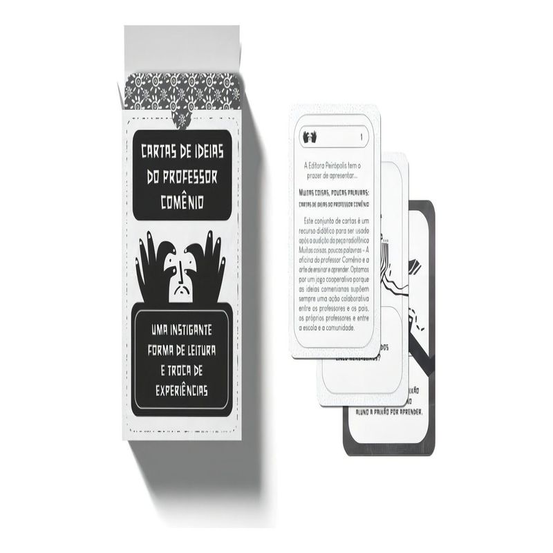 As Cartas de ideias do professor Comênio nasceram a partir da obra Muitas coisas, poucas palavras, uma peça radiofônica e livro cantante que apresenta aos leitores-ouvintes o encontro de Francisco Marques Vírgula Chico dos Bonecos e o professor Comênio, em um criativo diálogo sobre as ideias do educador europeu apresentadas em sua obra mais conhecida, a Didática Magna. Buscando trazer mais elementos para a reflexão, o autor juntou-se a Cyrce Andrade para criar esse interessante recurso didático (a ser usado após a audição da peça): um jogo de cartas cooperativo proposto a professores, famílias e comunidade escolar. Neste jogo, os participantes voltarão às principais ideias comenianas, reconhecendo os passos necessários para a tarefa de educar, mas também os percalços e as dificuldades que podem se apresentar no caminho. A proposta é colaborativa, sem que ao final se tenham perdedores ou vencedores: ao jogar, todos ganham ótimas oportunidades de refletir sobre a emocionante aventura de ensinar e de aprender.