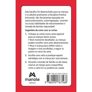 Seu rico conteúdo, embasado na série Disciplina Positiva de Jane Nelsen, é apresentado em cartas, com ilustrações coloridas, contendo dezenas das principais estratégias de forma objetiva e com exemplos de uso. São ferramentas baseadas em autoconhecimento, autorregulação, consciência social, habilidades de relacionamento e tomada de decisão responsável. Sugestões de como usar as cartas: 1. Coloque as cartas numa cesta especial para as crianças terem acesso. • Num momento desafiador, as crianças podem escolher uma carta aleatoriamente. • Peça à criança para refletir sobre a imagem e rima escolhidas, e seguir os passos no verso da carta. 2. Escolha uma carta e pratique aquela estratégia com a criança por uma semana. 3. Durante a reunião de família ou de classe, reserve um tempo para compartilhar como a carta foi ou poderia ser usada.