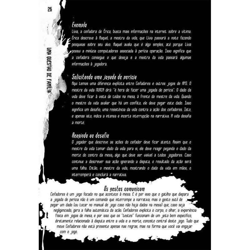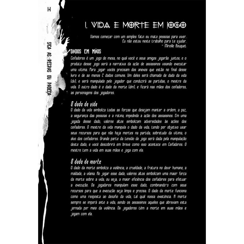 Ceifadores é um RPG de mesa sobre assassinos treinados. A cada partida uma vítima é revelada e os jogadores terão que criar um plano para executá-lo, cumprindo os desígnios do enclave da morte do qual fazem parte. Prepare-se para protagonizar a disputa entre a vida e a morte , um conflito que fará você sujar as mãos enquanto carrega o fardo de ser a pior versão de si mesmo para seguir em frente.