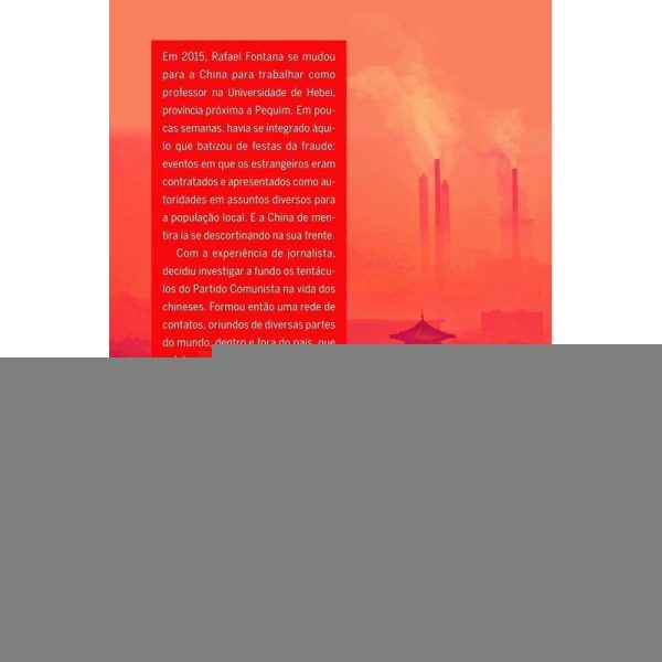 Em 2015, Rafael Fontana se mudou para a China para trabalhar como professor na Universidade de Hebei, província próxima a Pequim. Em poucas semanas, havia se integrado àquilo que batizou de festas da fraude: eventos em que os estrangeiros eram contratados e apresentados como autoridades em assuntos diversos para a população local. E a China de mentira ia se descortinando na sua frente. Com a experiência de jornalista, decidiu investigar a fundo os tentáculos do Partido Comunista na vida dos chineses. Formou então uma de contatos, oriundos de diversas partes do mundo, dentro e fora do país, que colaboravam com informações em tempo real. De volta ao Brasil, foi contratado pela gigante chinesa do 5G Huawei, o que completou seu pacote de dados sobre a ação do PCCh no mundo. O que ele traz aqui pode ser comparado a uma bomba, já armada, e próxima de explodir. Sua investigação é um alerta para todos os países – especialmente o Brasil –, sobre questões de segurança e os mecanismos que a ditadura desenvolveu para minar democracias, controlar informações e expandir seu projeto totalitário para além de suas fronteiras