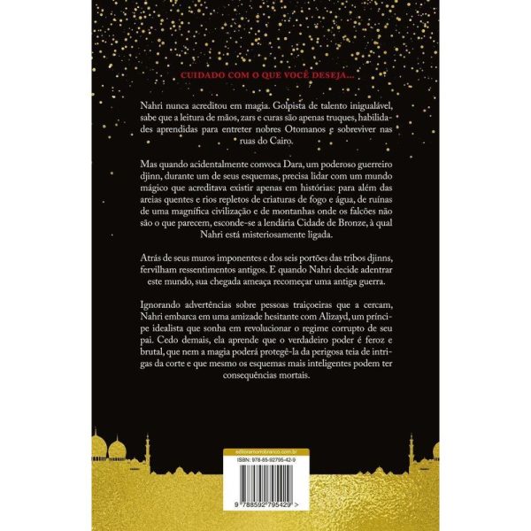 Nahri nunca acreditou em magia. Golpista de talento inigualável, sabe que a leitura de mãos, zars e curas são apenas truques, habilidades para entreter nobres. Otomamos e sobreviver nas ruas do Cairo. Mas quando acidentalmente convoca Dara, um poderoso guerreiro djinn, durante um de seus esquemas, precisa lidar com um mundo mágico que acreditava existir apenas em histórias: para além das areias quentes e rios repletos de criaturas de fogo e água, de ruínas de uma magnífica civilização e de montanhas onde os falcões não são o que parecem, esconde-se a lendária Cidade de Bronze, à qual Nahri está misteriosamente ligada. Atrás de seus muros imponentes e dos seis portões das tribos djinns, fervilham ressentimentos antigos. E quando Nahri decide adentrar este mundo, sua chegada ameaçã recomeçar uma antiga guerra. Ignorando advertências sobre pessoas traiçõeiras que a cercam, Nahri embarca em uma amizade hesitante com Alizayd, um príncipe idealista que sonha em revolucionar o regime corrupto de seu pai. Cedo demais, ela aprende que o verdadeiro poder é feroz e brutal, que nem a magia poderá protege-lá da perigosa teia de intrigas da corte e que mesmo os esquemas mais inteligentes podem ter consequências mortais.