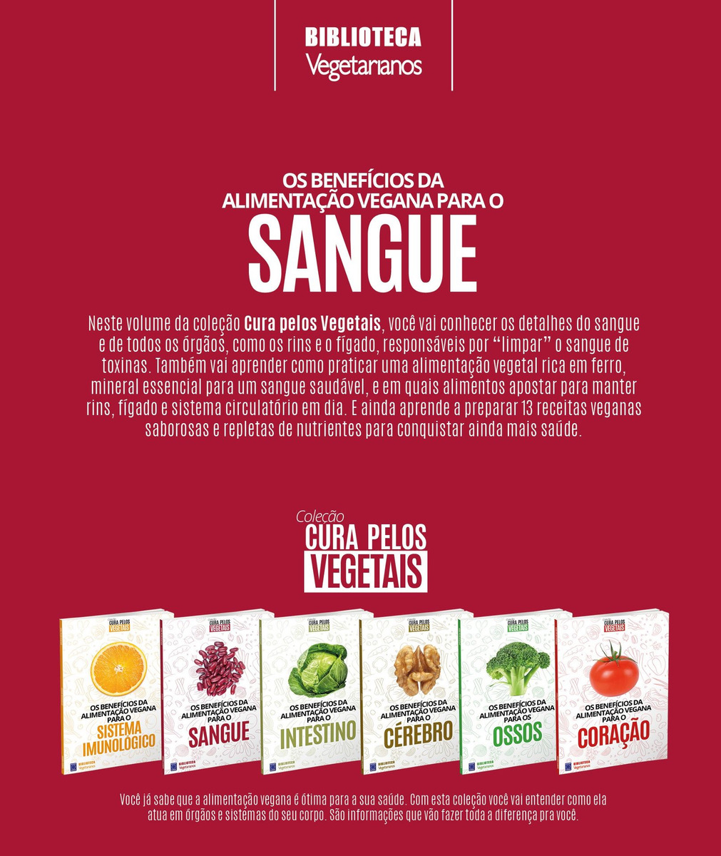 Neste volume da coleção Cura pelos Vegetais, você vai conhecer os detalhes do sangue e de todos os órgãos, como os rins e o fígado, responsáveis por “limpar” o sangue de toxinas. Também vai aprender como praticar uma alimentação vegetal rica em ferro, mineral essencial para um sangue saudável, e em quais alimentos apostar para manter rins, fígado e sistema circulatório em dia. E ainda aprende a preparar 13 receitas veganas saborosas e repletas de nutrientes para conquistar ainda mais saúde.