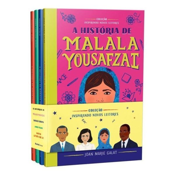 Anne Frank era uma jovem judia que viveu durante a Segunda Guerra Mundial, quando pessoas como ela foram perseguidas pelo simples fato de seguirem a religião judaica. Para tentar sobreviver, ela e sua família foram obrigadas a se refugiar em um esconderijo que ficava dentro do prédio em que o pai de Anne trabalhava. Enquanto os anos se passavam, a garota compartilhava medos, sentimentos e, principalmente, a esperança de um mundo melhor em seu diário, que acabou sendo editado e transformado em livro, lançado em mais de setenta idiomas. Com a força de suas palavras, Anne emocionou o mundo e virou um símbolo de coragem e resistência ao Holocausto e aos horrores praticados durante a guerra. Mesmo com o preconceito contra a cor de sua pele, Barack Obama cresceu sentindo-se livre para sonhar e ser o que quisesse. E seu grande sonho, desde menino, sempre foi ajudar as pessoas. Foi por isso que ele se tornou presidente dos Estados Unidos, o primeiro negro a assumir esse importante cargo. Mas, antes de fazer história lutando pelos direitos civis, ele foi uma criança inteligente e cheia de vontade de transformar o mundo em um lugar melhor. Descubra como Barack passou de um menino sonhador para um dos líderes mais prestigiados e respeitados que já existiu. Malala Yousafzai era apenas uma criança quando se tornou uma ativista corajosa. Antes de lutar bravamente pelo direito das meninas de poder estudar, ela era uma garota doce e atenciosa, que gostava de ir à escola, de brincar com os vizinhos e os irmãos e, como toda criança, de sonhar acordada. Aos dez anos, Malala, uma das melhores alunas de sua turma, foi impedida de estudar – ela e todas as meninas da região onde morava. Mas ela não deixou que isso a impedisse. Com a força de sua voz, provou que até mesmo uma criança pode ajudar a mudar o mundo. Descubra como Malala defendeu a igualdade de direitos e se tornou a pessoa mais jovem a receber o Prêmio Nobel da Paz. Desde muito jovem, Martin Luther King Jr. conviveu com o racismo, devido à cor de sua pele. Ele cresceu em uma época em que pessoas brancas e negras não podiam dividir os mesmos espaços públicos, principalmente no sul dos Estados Unidos. Assim, o menino inteligente que sonhava em ser bombeiro, médico e até artista transformou-se em um dos líderes mais importantes da história na busca pelos direitos dos negros, ao combater a segregação racial. Com discursos poderosos e protestos pacíficos, Martin desafiou o racismo e lutou por um mundo mais justo para todos.
