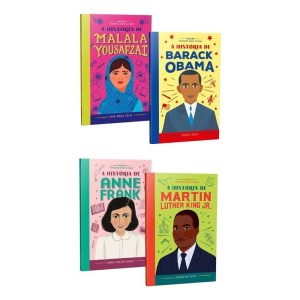 Anne Frank era uma jovem judia que viveu durante a Segunda Guerra Mundial, quando pessoas como ela foram perseguidas pelo simples fato de seguirem a religião judaica. Para tentar sobreviver, ela e sua família foram obrigadas a se refugiar em um esconderijo que ficava dentro do prédio em que o pai de Anne trabalhava. Enquanto os anos se passavam, a garota compartilhava medos, sentimentos e, principalmente, a esperança de um mundo melhor em seu diário, que acabou sendo editado e transformado em livro, lançado em mais de setenta idiomas. Com a força de suas palavras, Anne emocionou o mundo e virou um símbolo de coragem e resistência ao Holocausto e aos horrores praticados durante a guerra. Mesmo com o preconceito contra a cor de sua pele, Barack Obama cresceu sentindo-se livre para sonhar e ser o que quisesse. E seu grande sonho, desde menino, sempre foi ajudar as pessoas. Foi por isso que ele se tornou presidente dos Estados Unidos, o primeiro negro a assumir esse importante cargo. Mas, antes de fazer história lutando pelos direitos civis, ele foi uma criança inteligente e cheia de vontade de transformar o mundo em um lugar melhor. Descubra como Barack passou de um menino sonhador para um dos líderes mais prestigiados e respeitados que já existiu. Malala Yousafzai era apenas uma criança quando se tornou uma ativista corajosa. Antes de lutar bravamente pelo direito das meninas de poder estudar, ela era uma garota doce e atenciosa, que gostava de ir à escola, de brincar com os vizinhos e os irmãos e, como toda criança, de sonhar acordada. Aos dez anos, Malala, uma das melhores alunas de sua turma, foi impedida de estudar – ela e todas as meninas da região onde morava. Mas ela não deixou que isso a impedisse. Com a força de sua voz, provou que até mesmo uma criança pode ajudar a mudar o mundo. Descubra como Malala defendeu a igualdade de direitos e se tornou a pessoa mais jovem a receber o Prêmio Nobel da Paz. Desde muito jovem, Martin Luther King Jr. conviveu com o racismo, devido à cor de sua pele. Ele cresceu em uma época em que pessoas brancas e negras não podiam dividir os mesmos espaços públicos, principalmente no sul dos Estados Unidos. Assim, o menino inteligente que sonhava em ser bombeiro, médico e até artista transformou-se em um dos líderes mais importantes da história na busca pelos direitos dos negros, ao combater a segregação racial. Com discursos poderosos e protestos pacíficos, Martin desafiou o racismo e lutou por um mundo mais justo para todos.