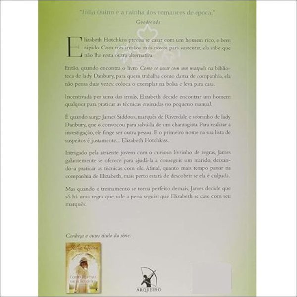 Elizabeth Hotchkiss precisa se casar com um homem rico, e bem rápido. Com três irmãos mais novos para sustentar, ela sabe que não lhe resta outra alternativa. Então, quando encontra o livro Como se casar com um marquês na biblioteca de lady Danbury, para quem trabalha como dama de companhia, ela não pensa duas vezes: coloca o exemplar na bolsa e decide encontrar um homem qualquer para praticar as técnicas ensinadas no pequeno manual. É quando surge James Siddons, marquês de Riverdale e sobrinho de lady Danbury, que o convocou para salvá-la de um chantagista. Para realizar a investigação, ele finge ser outra pessoa. E o primeiro nome na sua lista de suspeitos é justamente… Elizabeth Hotchkiss. Intrigado pela atraente jovem com o curioso livrinho de regras, James galantemente se oferece para ajudá-la a conseguir um marido, deixando-a praticar as técnicas com ele. Afinal, quanto mais tempo passar na companhia de Elizabeth, mais perto estará de descobrir se ela é culpada. Mas quando o treinamento se torna perfeito demais, James decide que só há uma regra que vale a pena seguir: que Elizabeth se case com seu marquês.