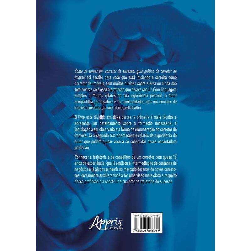 Como se tornar um corretor de sucesso: guia prático do corretor de imóveis foi escrito para você que está iniciando a carreira como corretor de imóveis, tem muitas dúvidas sobre a área ou ainda não tem certeza se é essa a profissão que deseja seguir. Com linguagem simples e muitos relatos de sua experiência pessoal, o autor compartilha os desafios e as oportunidades que um corretor de imóveis encontra em sua rotina de trabalho. O livro está dividido em duas partes: a primeira é mais técnica e apresenta um detalhamento sobre a formação necessária, a legislação a ser observada e a forma de remuneração do corretor de imóveis. Já a segunda traz orientações e relatos da experiência do autor que podem ajudar você a se consolidar nessa encantadora profissão. Conhecer a trajetória e os conselhos de um corretor com quase 15 anos de experiência, que já realizou a intermediação de centenas de negócios e já ajudou a inserir no mercado dezenas de novos corretores, certamente auxiliará você a ter uma visão mais clara a respeito dessa profissão e a construir a sua própria trajetória de sucesso.