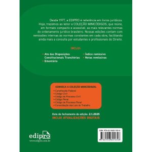 Desde 1977, a EDIPRO é referência em livros jurídicos. Hoje, trazemos ao leitor a COLEÇÃO MINICÓDIGOS, que reúne, em formato compacto e acessível, as mais relevantes normas do ordenamento jurídico brasileiro. Nossas edições contam com remissões internas às normas constantes em cada obra, facilitando ainda mais a consulta por estudantes e profissionais do Direito. INCLUI: Ato das Disposições Constitucionais Transitórias Ementário Índice remissivo Notas remissivas CONHEÇA A COLEÇÃO MINICÓDIGOS: Constituição Federal Código Civil Código de Processo Civil Código Penal Código de Processo Penal Consolidação das Leis do Trabalho
