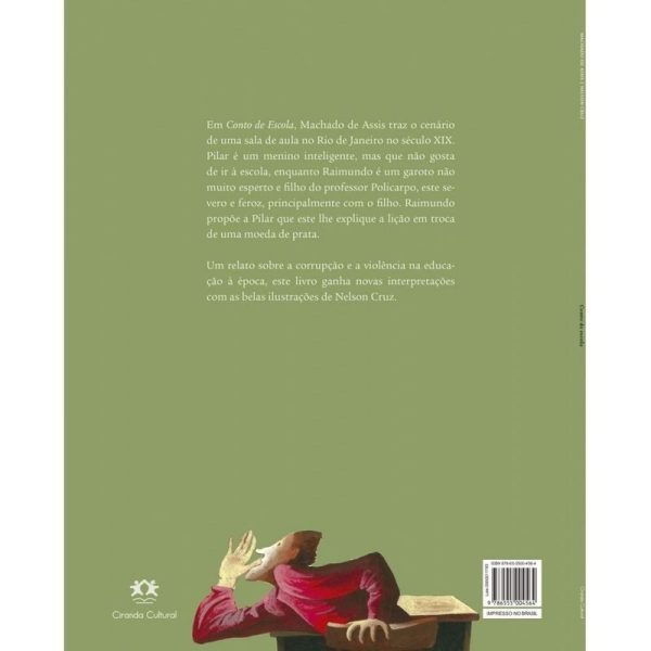 Machado de Assis traz em Conto de Escola, nesta versão ilustrado por Nelson Cruz, um cenário do Rio de Janeiro do século XIX, com uma crítica à corrupção e à violência que havia na educação na época. A história relata Pilar, um menino inteligente mas que não gosta de ir à escola, e Raimundo, garoto não muito esperto e filho do professor Policarpo, este severo e feroz, principalmente com o filho. Certo dia, Raimundo propõe a Pilar lhe explicar a lição, em troca de uma moeda de prata. Mas Curvelo, um garoto valentão da turma, entrega os dois meninos ao professor, que lhes prega um penoso castigo.
