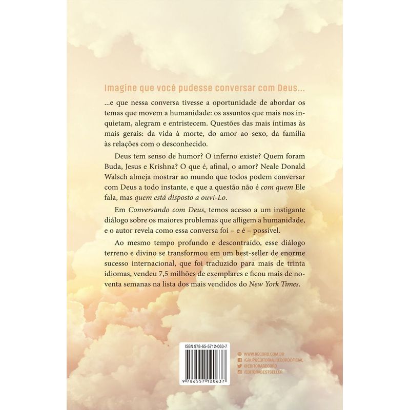 E se você pudesse ter uma longa e honesta conversa com… Deus? Neale Donald Walsch narra no best-seller Conversas com Deus um diálogo travado com Deus e como o leitor também pode viver essa transformadora experiência. Walsch conta como sempre teve uma certeza: ele sempre soube que falava com Deus. Direta e pessoalmente. Incontestavelmente. E que Ele respondia às suas perguntas em proporção direta à sua capacidade de compreender. Isto é, Deus o respondia de maneiras e com a linguagem que sabia que o autor entenderia.Isso explica em grande parte o estilo informal do livro e as referências a outras fontes e experiências anteriores do próprio autor. Walsch conta como descobriu que tudo o que já recebeu veio de Deus, reunindo em uma resposta maravilhosa e completa para todas as perguntas que já foram feitas. Em Conversas com Deus, temos acesso a um instigante diálogo sobre os maiores problemas que afligem a humanidade e o autor revela como essa conversa foi – e é – possível.Ao mesmo tempo profundo e descontraído, esse diálogo terreno e divino se transformou em uma série de enorme sucesso internacional, que foi traduzida para mais de trinta idiomas, vendeu 7,5 milhões de exemplares e ficou mais de noventa semanas na lista dos mais vendidos do New York Times. E a grande mensagem de Conversas com Deus é: Deus fala com todos nós e há sempre o que aprender desta enriquecedora conversa.Conversas com Deus é um presente maravilhoso para aqueles que gostam de fazer perguntas e realmente querem saber as respostas, que buscam a verdade com o coração sincero, a alma ansiosa e a mente aberta.