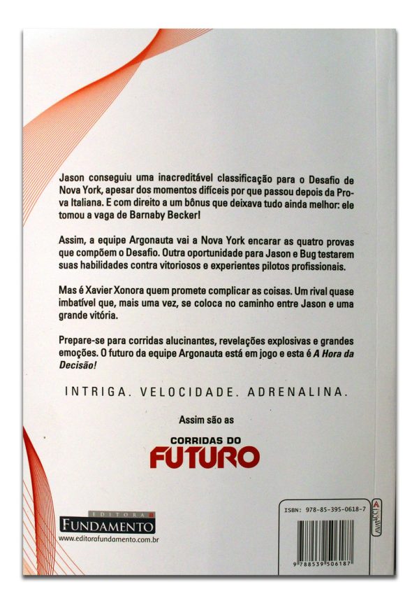 Jason conseguiu uma inacreditável classificação para o Desafio de Nova York, apesar dos momentos difíceis por que passou depois da Prova Italiana. E com direito a um bônus que deixava tudo ainda melhor: ele tomou a vaga de Barnaby Becker! Assim, a equipe Argonauta vai a Nova York encarar as quatro provas que compõem o Desafio. Outra oportunidade para Jason e Bug testarem suas habilidades contra vitoriosos e experientes pilotos profissionais. Mas é Xavier Xonora quem promete complicar as coisas. Um rival quase imbatível que, mais uma vez, se coloca no caminho entre Jason e uma grande vitória. Prepare-se para corridas alucinantes, revelações explosivas e grandes emoções. O futuro da equipe Argonauta está em jogo e esta é A Hora da Decisão! Intriga. Velocidade. Adrenalina. Assim são as Corridas do Futuro.