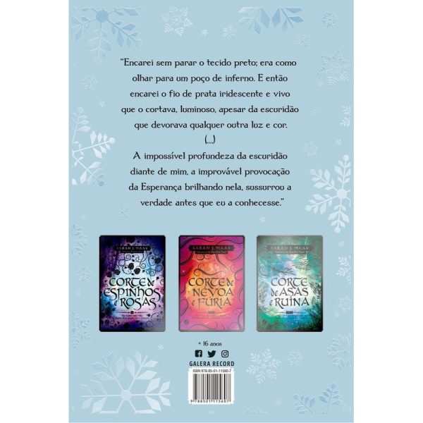 “O aguardado spin-off da série Corte de Espinhos e Rosas.Feyre, Rhys e seu círculo íntimo de amigos ainda estão ocupados reconstruindo a Corte Noturna e tentando manter a paz, conquistada a base de muito esforço e perdas pessoais, após a queda da muralha.Mas o Solstício de Inverno finalmente está próximo e, com isso, um alívio merecido. Compras, festas, celebração e a promessa de dias tranquilos. A atmosfera festiva não consegue, entretanto, impedir que as sombras da guerra se aproximem.Em seu primeiro Solstício como Grã-Senhora, Feyre ainda lida com os horrores do passado recente e percebe que seu parceiro e sua família têm mais cicatrizes do que ela esperava – cicatrizes que podem impactar o futuro, e a paz, de sua Corte.”