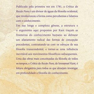 Publicada pela primeira vez em 1781, a Crítica da Razão Pura é um divisor de águas da filosofia ocidental, que revolucionou a forma como percebemos e lidamos com o conhecimento. Em sua longa e complexa gênese, a estrutura e o argumento aqui propostos por Kant traçam as fronteiras do conhecimento humano ao delinear um afastamento radical das formas de concepção precedentes, contrastando-as com os esboços de sua filosofia transcendental, e tornar-se uma influência inevitável aos movimentos filosóficos subsequentes. Uma das obras mais conceituadas da filosofia de todos os tempos, a Crítica da Razão Pura, de Immanuel Kant, é leitura obrigatória para todos os que almejam investigar em profundidade a filosofia do conhecimento. Nova tradução do alemão com notas e numeração referencial da Academia de Ciências (Conforme edição original – Berlim, 1911).