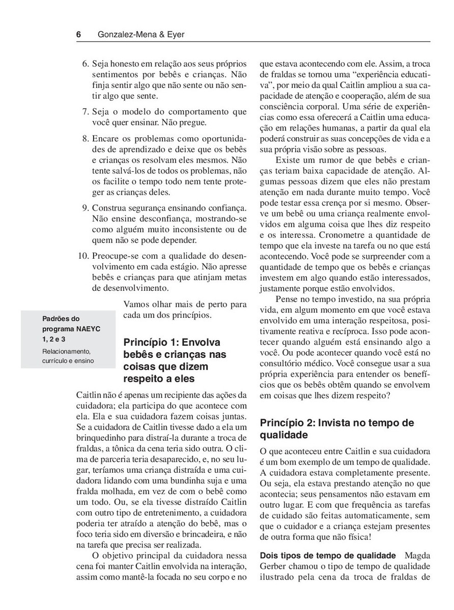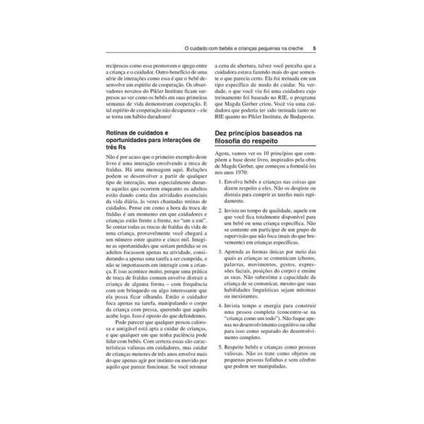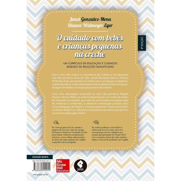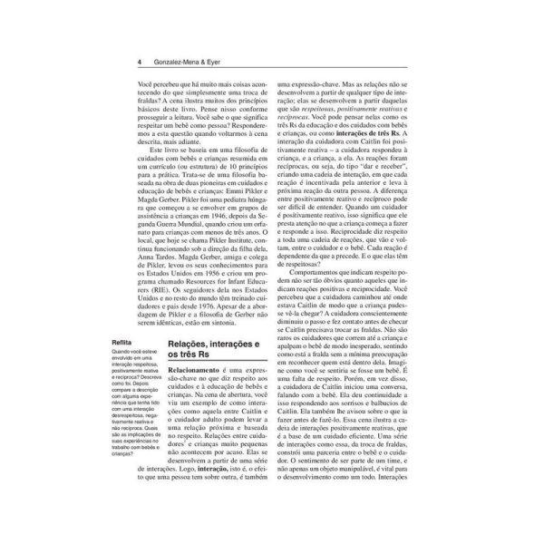 Esta e uma obra sobre a importancia do cuidado e da educacao nos tres primeiros anos de vida. Janet Gonzalez-Mena e Dianne Widmeyer-Eyer apresentam a creche como um espaco verdadeiramente educativo, onde relacionamentos se desenvolvem e a aprendizagem de bebes e criancas pequenas e abundante. Com uma abordagem inspirada na obra das pioneiras Magda Gerber e Emmi Pikler, as autoras desenvolvem um modo de trabalho baseado no cuidado, que valoriza a brincadeira e a exploracao de materiais e ambientes, e oferecem orientacoes precisas para uma pedagogia de bebes e criancas pequenas. Essas caracteristicas fazem deste livro referencia nas praticas educativas dos primeiros anos da educacao infantil.