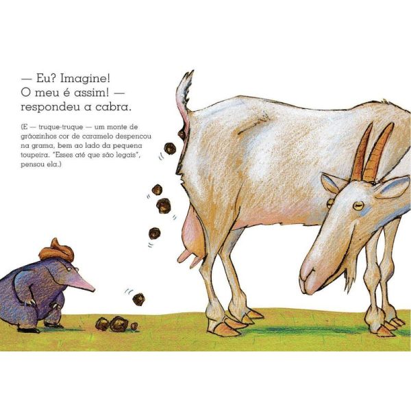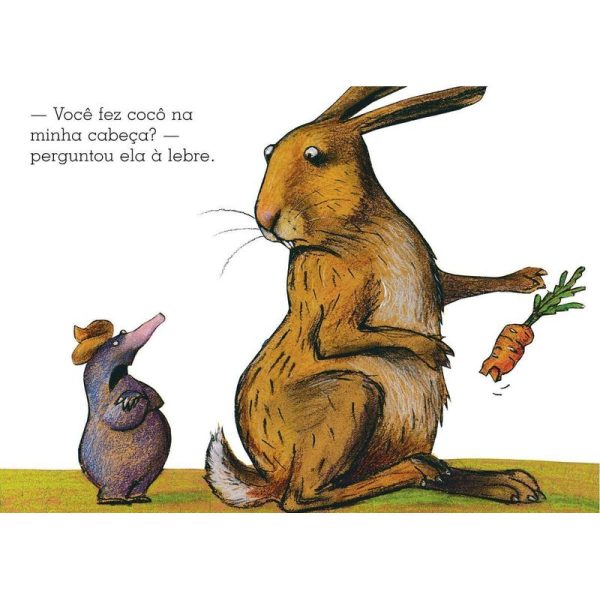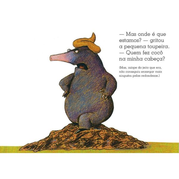 O título deste livro simpaticíssimo não deixa a menor dúvida quanto ao tema tratado. O problema se apresenta certa manhã, quando a toupeirinha ia saindo de sua toca: quem teria feito cocô sobre sua cabeça? Para esclarecer o enigma, ela interroga todos os animais que encontra no campo: o cavalo, a pomba, a vaca, o porco… E os diversos bichos suspeitos, para se inocentar, exibem os respectivos cocôs à toupeira: há aqueles pequenos, de animais pequenos; há os de formato peculiar, etc. – cada animal corresponde a um excremento diferente. Até que, finalmente, graças à ajuda de uma dupla de especialistas – duas moscas pretas -, a toupeira encontra o culpado e dá um jeito de se vingar condignamente.As crianças adoram. Durante alguns anos de suas vidas elas acham o assunto fascinante. Além disso, explorá-lo lhes dá oportunidade de nomear o que normalmente deve permanecer oculto – e ao prazer da suposta infração se soma o do desvendamento.Título Altamente Recomendável pela Fundação Nacional do Livro Infantil e Juvenil – FNLIJ 1994, categoria tradução/criança