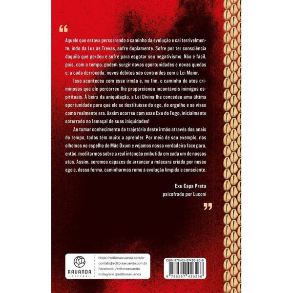 Nesta obra, somos apresentados à história de um irmão em desequilíbrio que, no fim dos anos 1990, passou a última encarnação como chefe do tráfico de drogas em uma favela carioca. Sob a supervisão dos exus Tranca-Ruas das Almas e Capa Preta, ele relata sua última existência e conta como foi responsável por viciar e matar inúmeras pessoas, queimando muitas delas vivas, tudo em nome do dinheiro e de uma falsa sensação de poder. Em seguida, aos poucos, os exus vão permitindo que o quiumba acesse memórias de outras encarnações. A partir deste ponto, descobrimos que tratava-se de um espírito milenar que já tinha recebido várias oportunidades de resgate reencarnatório, mas que, em todas elas, caiu, sempre em nome do egoísmo, do vício e da ganância. Em todas as encarnações, tornou-se um assassino, acabando com as chances que recebeu. Além disso, o elemento fogo sempre foi determinante em cada uma das passagens desse espírito. Por isso, é no Reino do Fogo, regido por Xangô, que o quiumba recebe sua última chance de redenção, atuando como um exu para resgatar os débitos contraídos nas vidas que teve. Nesta obra, entenderemos mais sobre a Lei de Causa e Consequência e a construção dos planos reencarnatórios nas entevidas, além do processo de “exunização”.