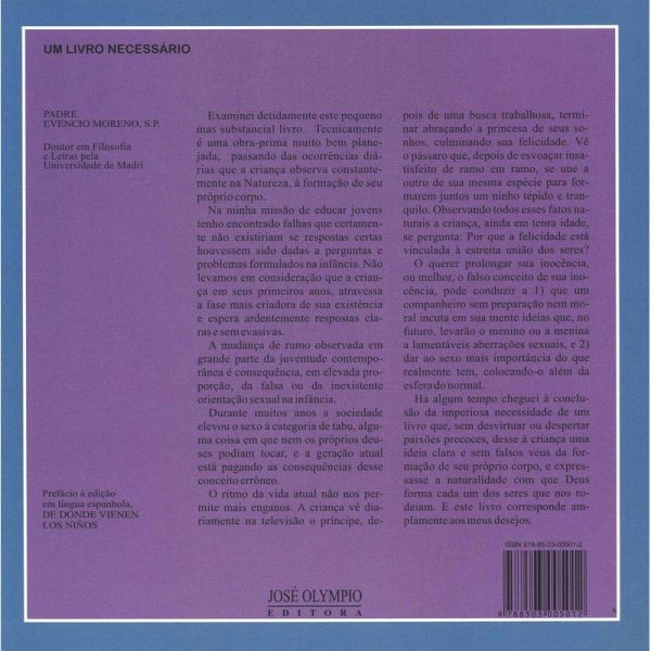 “””Tecnicamente é uma obra-prima muito bem planejada, passando das ocorrências diárias que a criança observa constantemente na Natureza à formação de seu próprio corpo.”” – Padre Evenício Moreno, Doutor em Letras e Filosofia pela Universidade de Madri. Elaborado por um grupo constituído de educadores, psicólogos, médicos e técnicos especializados em pedagogia do Conselho Americano de Informação e Educação Sexual, De onde vêm os bebês é um clássico de sucesso em vários países pelo seu valor educacional. Com ilustrações coloridas que primam pela fidelidade, a obra traz pequenos textos informativos sobre o nascimento dos seres humanos e de alguns animais. Este livro é um instrumento sadio e seguro aos pais e educadores, cujo propósito é orientar com propriedade filhos e alunos. Ao adulto, também, este livro servirá como método de ensino de matéria delicada, mas cada vez mais necessária. De onde vêm os bebês é uma obra inspirada em princípios de universalidade e se aplica à nossa maneira particular brasileira. “
