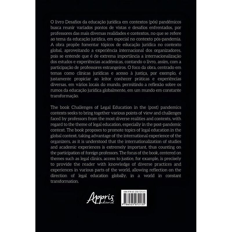 O livro Desafios da educação jurídica em contextos (pós) pandêmicos busca reunir variados pontos de vistas e desafios enfrentados, por professores das mais diversas realidades e contextos, no que se refere ao tema da educação jurídica, em especial no contexto pós-pandemia. A obra propõe fomentar tópicos de educação jurídica no contexto global, aproveitando a experiência internacional dos organizadores, pois se entende que é de extrema importância a internacionalização dos estudos e experiências acadêmicas, contando o livro, assim, com a participação de professores estrangeiros. O foco da obra, centrado em temas como clínicas jurídicas e acesso à justiça, por exemplo, é justamente propiciar ao leitor conhecer práticas e experiências diversas, em vários locais do mundo, permitindo a reflexão sobre os rumos da educação jurídica globalmente, em um mundo em constante transformação. The book Challenges of Legal Education in the (post) pandemics contexts seeks to bring together various points of view and challenges faced by professors from the most diverse realities and contexts, with regard to the theme of legal education, especially in the post-pandemic context. The book proposes to promote topics of legal education in the global context, taking advantage of the international experience of the organizers, as it is understood that the internationalization of studies and academic experiences is extremely important, thus counting on the participation of foreign professors. The focus of the book, centered on themes such as legal clinics, access to justice, for example, is precisely to provide the reader with knowledge of diverse practices and experiences in various parts of the world, allowing reflection on the direction of legal education globally, in a world in constant transformation.