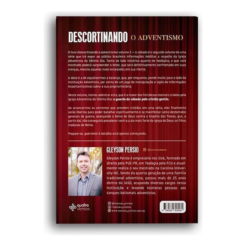 O livro “Descortinando o Adventismo – Vol 2: O Sábado” é o segundo volume de uma série que irá expor ao público brasileiro informações inéditas a respeito da Igreja Adventista do Sétimo Dia. Tanto do lado histórico, quanto teológico, o que será mostrado poderá surpreender o leitor que será definitivamente confrontado em suas crenças, mesmo aquelas mais enraizadas em suas mentes. A ideia é a de equalizarmos a balança que, por enquanto, pende muito para o lado da Instituição Adventista através de um jogo de manipulação e segredo de informações importantíssimas sobre a sua própria história. Neste volume 2, iremos adentrar nesta que é a maior das fortalezas mentais criadas pela Igreja Adventista do Sétimo Dia: a guarda do Sábado pelo cristão gentio. Ao arrancarmos as correntes que prendem cristãos em uma seita, eles finalmente são libertos para poder batalhar espiritualmente e se manifestar como destemidos generais de guerra, avançando o Reino de Deus contra o Império das Trevas que a partir daí, não conseguirá prevalecer contra a ala mais forte da igreja de Deus: os filhos maduros do Reino. Prepare-se guerreiro! A batalha está apenas começando.