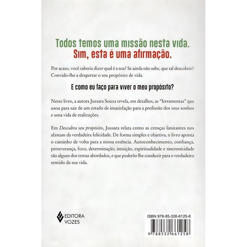 Neste livro, a autora Jussara Souza revela, em detalhes, as “ferramentas” que usou para sair de um estado de insatisfação para a profissão dos seus sonhos e uma vida de realizações. Em Descubra seu propósito, a autora relata como as crenças limitantes nos afastam da verdadeira felicidade. De forma simples e objetiva, o livro aponta o caminho de volta para a nossa essência. Autoconhecimento, confiança, perseverança, foco, determinação, intuição, espiritualidade e sincronicidade são alguns dos temas abordados, e que poderão lhe conduzir para o verdadeiro sentido da sua vida.