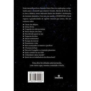 Neste maravilhoso livro, Haroldo Dutra Dias traz ensinamentos do Antigo Testamento, Novo Testamento, das Obras Básicas e outras obras da literatura espírita – principalmente as obras de Emmanuel e André Luiz – com explicações e orientações para o momento que estamos vivendo. Aborda de forma clara, leve e didática, temas relevantes diante dos desafios e atribulações da transição planetária. Com isso, nos auxilia a DESPERTAR a força, riqueza e grandiosidade do espírito imortal que somos. Ele nos esclarece sobre: Causas das aflições Justiça divina – O segredo da reforma íntima – Nossa relação com Deus – Descobrindo quem eu sou – Fraquezas da alma – Educar sentimentos – É tempo de renovar – Pensamento e vida – Bem-aventurados os mansos e pacíficos – O homem de bem – Pátria do Evangelho e a transição planetária – Qual o sentido da sua vida? – A felicidade é deste mundo? – Quem são os trabalhadores da última hora?