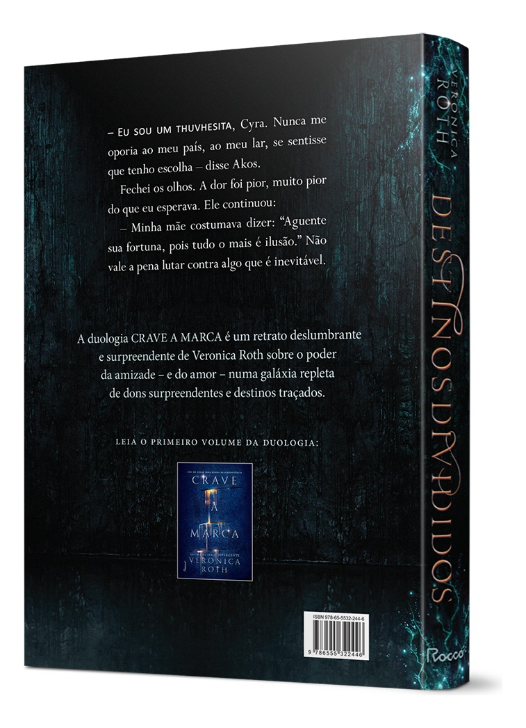 O DESTINO OS REUNIU. E AGORA IRÁ DIVIDI-LOS. As vidas de Cyra Noavek e Akos Kereseth são pautadas por suas fortunas, destinos que foram traçados no dia de seus nascimentos. Não se pode escapar da fortuna, uma vez que ela está estabelecida. Akos está apaixonado por Cyra, apesar de isso ir contra sua fortuna: ele deverá morrer a serviço da família de Cyra. E quando o pai de Cyra, Lazmet Noavek – um tirano desalmado – recupera o trono de Shotet, Akos acredita que seu fim está próximo. Com Lazmet incendiando a mais bárbara guerra contra Thuve, Cyra e Akos querem pará-lo a todo o custo. Para a garota, isso significa tirar a vida do homem que pode ser, ou não, seu pai. E para ele, significa dar sua própria vida. Nessa história brilhante, os dois vão descobrir como o destino age de formas mais inesperadas. A continuação do livro Crave a Marca, da autora do best-seller Divergente Veronica Roth, mostra como Cyra e Akos irão enfrentar seus destinos. Destinos divididos é uma rica história que fala em esperança e resiliência contada de quatro diferentes perspectivas.