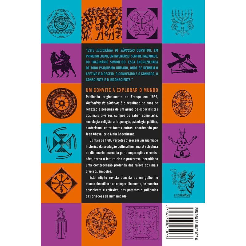 Dicionário de símbolos é um convite a explorar o mundo. Publicado originalmente na França em 1969, Dicionário de símbolos é o resultado de anos de reflexão e pesquisa de um grupo de especialistas dos mais diversos campos do saber, como arte, sociologia, religião, antropologia, psicologia, política, esoterismo, entre tantos outros, coordenados por Jean Chevalier e Alain Gheerbrant. Os mais de 1.600 verbetes oferecem um apanhado histórico da produção cultural humana. A estrutura do dicionário, marcada por comparações e remissões, torna a leitura rica e prazerosa, permitindo uma compreensão profunda das raízes dos mais diversos símbolos. Esta edição revista e atualizada convida ao mergulho no mundo simbólico e ao compartilhamento, de maneira consciente e reflexiva, dos potentes significados das criações da humanidade. Para os coordenadores, “Este Dicionário de símbolos constitui, em primeiro lugar, um inventário, sempre inacabado, do imaginário simbólico, essa encruzilhada de todo psiquismo humano, onde se reúnem o afetivo e o desejo, o conhecido e o sonhado, o consciente e o inconsciente.”