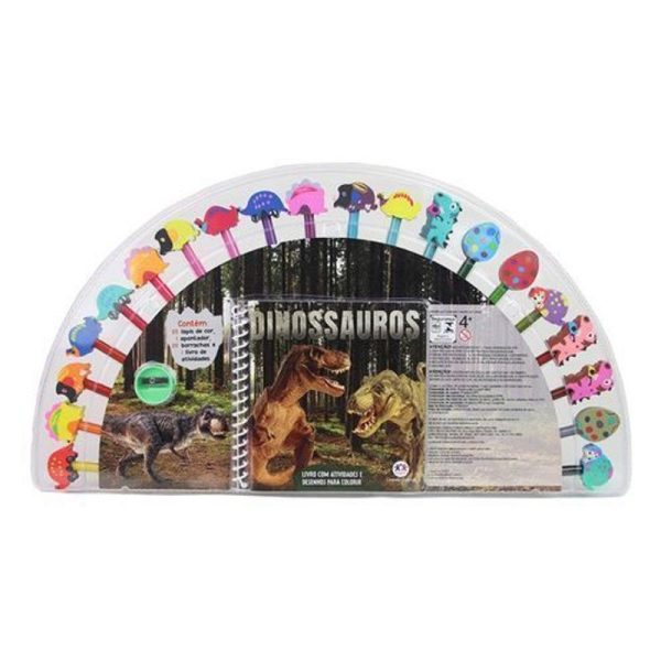 Divirta-se a valer com este kit de colorir! Além de um livro cheio de dinossauros para colorir e de atividades, você vai encontrar lápis de cor, borrachas coloridas e em formato de dinossauros, e um apontador! Não é demais?
