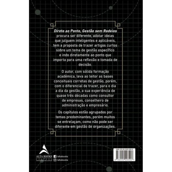 Direto ao Ponto, Gestão sem Rodeios procura ser diferente, adotar ideias que julguem inteligentes e aplicáveis, tem a proposta de trazer artigos curtos sobre um tema de gestão específico e indo diretamente ao ponto que importa para uma reflexão e tomada de decisão.O autor, com sólida formação acadêmica, leva ao leitor as bases conceituais corretas de gestão, porém, com o diferencial de trazer, para o dia a dia da gestão, a sua experiência de quase três décadas como consultor de empresas, conselheiro de administração e empresário.Os capítulos estão agrupados por temas predominantes, porém muitos se entrelaçam, como não pode ser diferente em gestão de organizações.