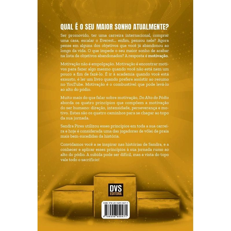 QUAL É O SEU MAIOR SONHO ATUALMENTE? Ser promovido, ter uma carreira internacional, comprar uma casa, escalar o Everest… enfim, pensou nele? Agora pense em alguns dos objetivos que você já abandonou ao longo da vida. O que impede o seu maior sonho de acabar na lista de objetivos abandonados? A resposta é motivação. Motivação não é empolgação. Motivação é encontrar motivos para fazer algo mesmo quando você não está nem um pouco a fim de fazê-lo. É ir à academia quando você está exausto, é ler um livro quando prefere assistir ao resumo no YouTube. Motivação é o combustível que pode levá-lo ao alto do pódio. Muito mais do que falar sobre motivação, Do Alto do Pódio aborda os quatro princípios que compõem a motivação do ser humano: direção, intensidade, perseverança e motivo. Estes são os quatro caminhos para se chegar ao topo da sua jornada. Sandra Pires utilizou esses princípios em toda a sua carreira e hoje é considerada uma das jogadoras de vôlei de praia mais bem-sucedidas da história. Convidamos você a se inspirar nas histórias de Sandra, e a conhecer e aplicar esses princípios à sua jornada rumo ao alto do pódio. A subida pode ser difícil, mas a vista do topo vale todo o sacrifício!